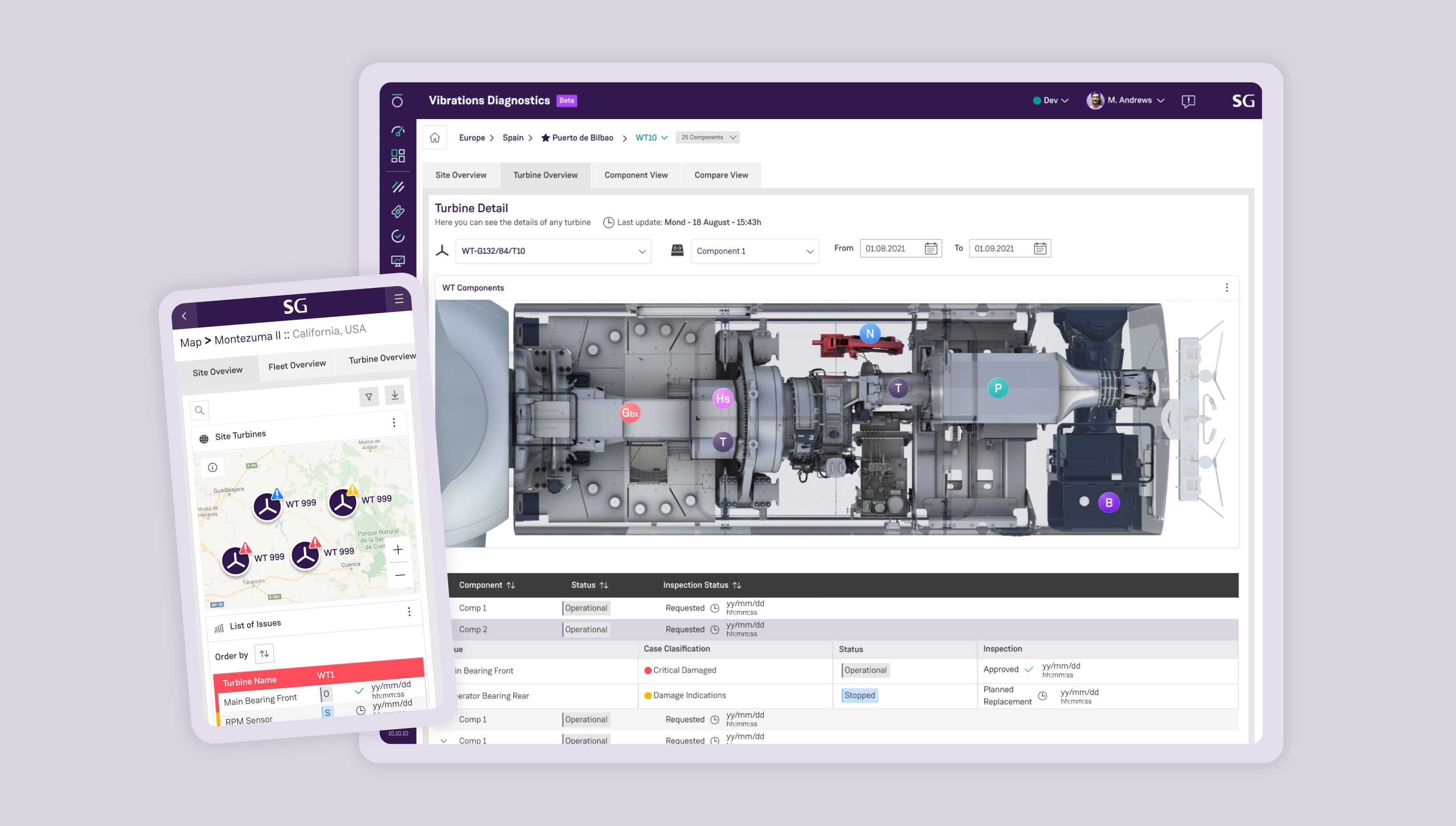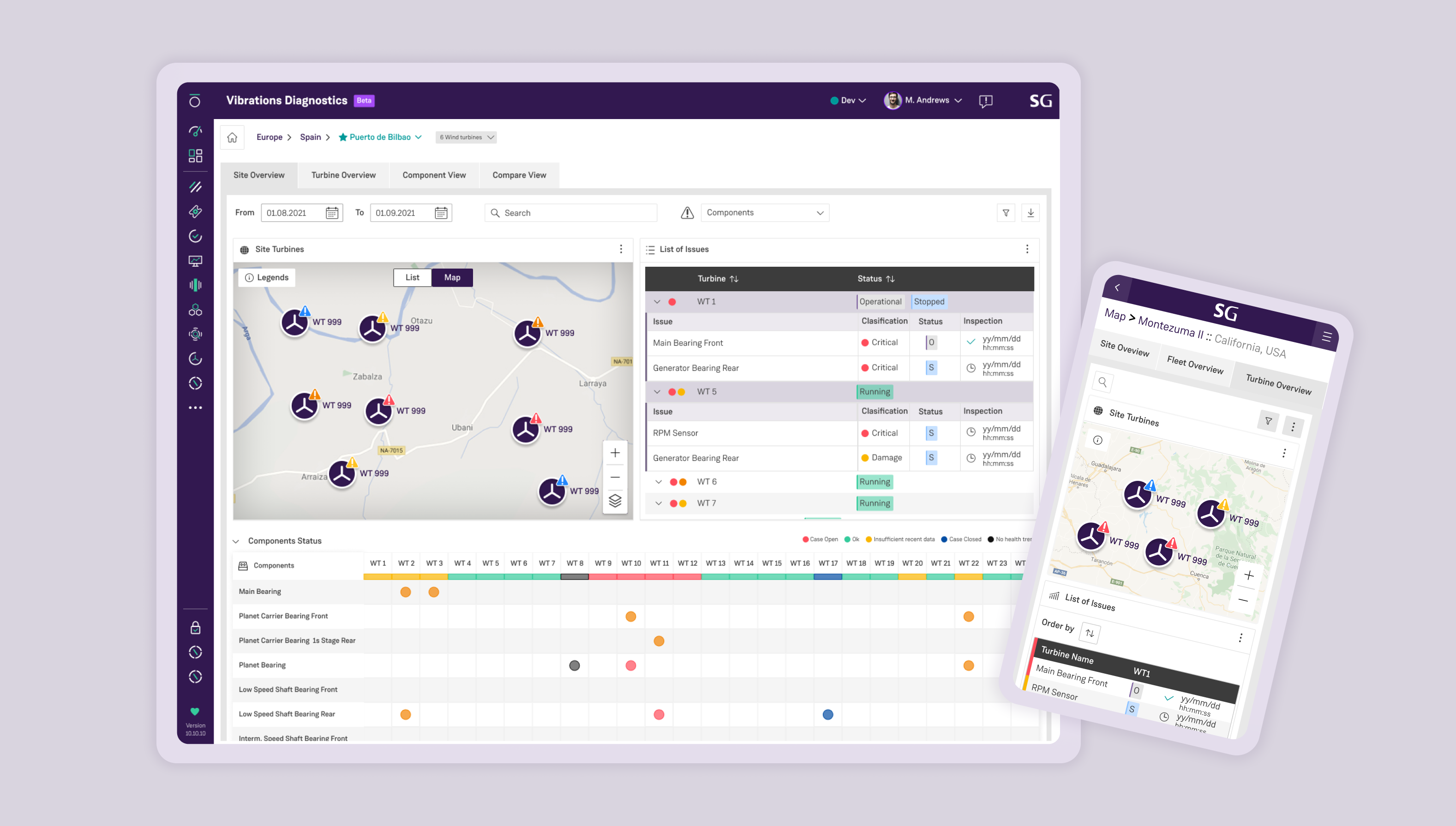Turbine Overview – Provides detailed information per turbine, including vibration metrics, performance data, and historical trends. This view helps technicians investigate specific turbines and identify potential failures quickly.