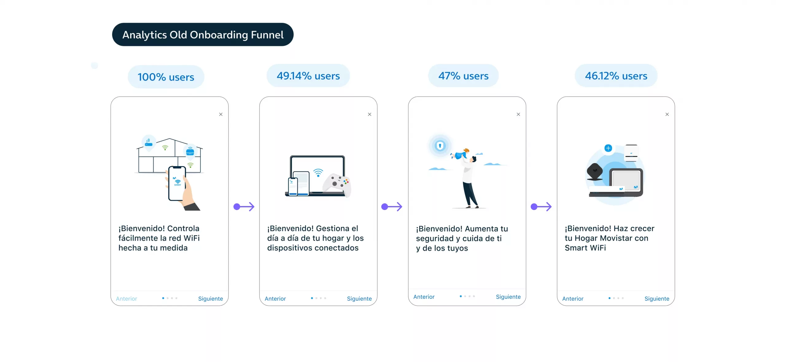 One of the most critical journeys in Smart WiFi is new user onboarding, as it sets the tone for engagement and retention. When users first open the app, they encounter a series of screens designed to explain the app’s main features and guide them into the experience. However, this step proved to be a significant barrier.